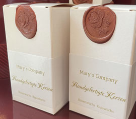 Materialien: Rapswachs, Rosenwachs (Rosa Certifolia Flower Cera), Runddocht, Kerzenfarbe.